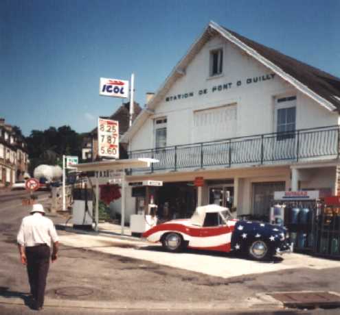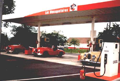 In this picture, Jim Miller takes petrol after the lunch stop at Pont d'Ouilly.